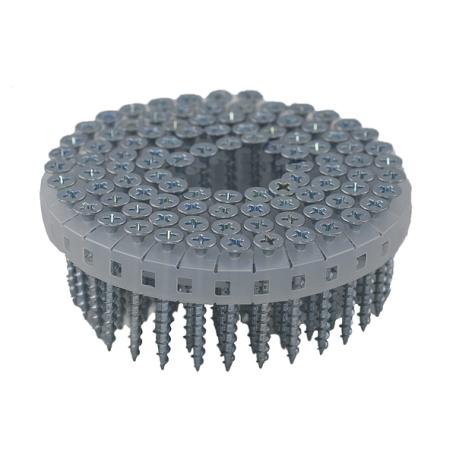 Gipsplateskruer, gips mot tre båndet - for bruk med høytrykk. Elektrolytisk forsinket med trompethode og phillips spor. Spesialskrue for montering av gipsplater til tre. Skruen har grove gjenger som gir godt hold og dobbelthodet for å unngå skader i gipsen. Testet 200 timer i salttåkekammer. Plasten som er brukt i Hitachi båndede skruer er optimalisert for å passe perfekt til Hitachi WF4H2. Form og utførelsen av båndet er ekstremt viktig for å få et feilfritt resultat. Anbefalt antall skruer - 20-30 stk/kvadratm. Bruksområde: Gipsplater mot tre. Stålkvalitet: AISI-1022. Min.vridningsmoment: 3,33 Nm. Korrosjonsklasse: C1 - Kun innendørs i oppvarmede bygninger med ren atmosfære.
