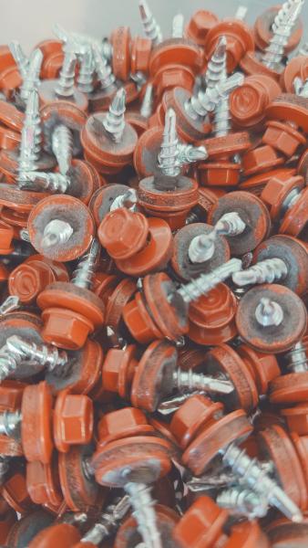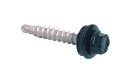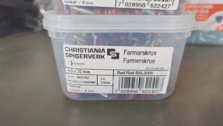 Farmerskrue 35 mm med borskjær og skive/pakning lakkert i LAL-farger for montering av stålplater mot tre. Borkapasitet i stål <1,25 mm. 20 mm lengde er for montering av stålplate eller beslag til stålplate. Leveres også i aluminium til samme formål, men beregnet for aluminiumplater.