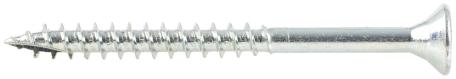 Treskrue elektrolytisk forsinket, herdet, med forsenket hode og torx spor. Alle skruer fra og med 40 mm er delgjenget. Gjengelengde for delgjengede skruer = 60% av total skruelengde (maks 72 mm). Skruelengder fra og med 25 mm, har spiss med fiberkutt som hindrer sprekkdannelse ved innskruing. Stålkvalitet: AISI-1022. Min.vridningsmoment: 1,64 -11 Nm. Min.bøyningsgrad: 15 grader. Korrosjonsklasse: C1 - Kun innendørs i oppvarmede bygninger med ren atmosfære.