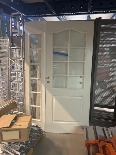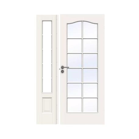 Dette er en dobbel innvendig glassdør i klassisk hvit utførelse uten medfølgende karm. Dørene har sprosseinndelte glassfelt med frostet eller klart glass (avhengig av modell) og tradisjonell formet speil på nedre del av hoveddøren. Den ene døren er hel med låskasse og messingfarget vrider, mens sidefeltet fungerer som passiv dør med matchende design. Typisk brukt mellom stue og kjøkken, eller som romdeler i større innvendige åpninger der man ønsker lysgjennomgang samtidig som man kan lukke av rommet.