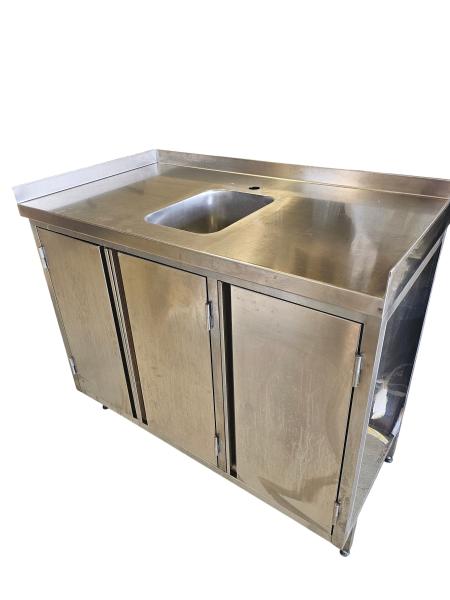 Solid oppvaskbenk i rustfritt stål, perfekt til storkjøkken, restaurant, kantine eller verksted. Praktisk løsning med integrert kum og romslig underskap med flere dører for oppbevaring.