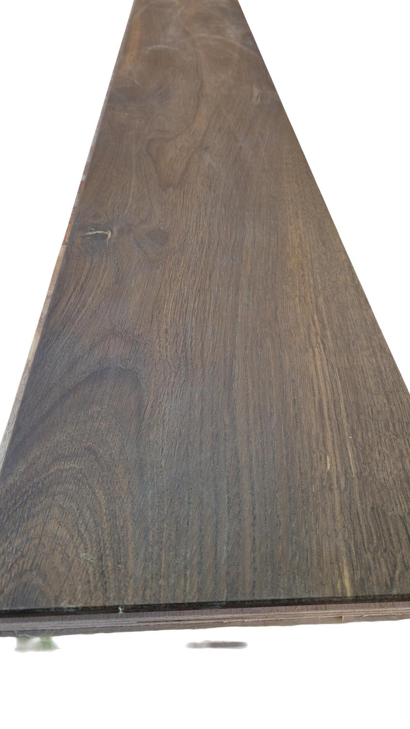 Pen og solid parkett i mørk, varm tone med tydelig åremønster og naturlig variasjon i treverket. Gir et eksklusivt og tidløst uttrykk som passer godt i både moderne og klassiske rom. Overflaten har et levende preg med naturlige detaljer som gir gulvet karakter.