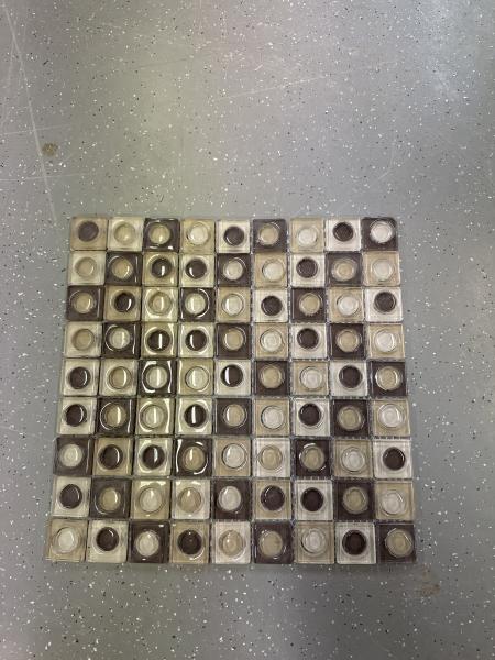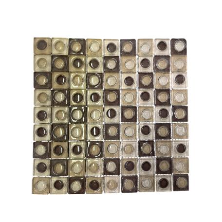 Unikt parti med retroinspirert glassmosaikk i brune og beige toner med sirkelmønster i midten. Platene måler 30 x 30 cm og består av små mosaikkfliser med dybdeeffekt som gir et spennende og lekent uttrykk.