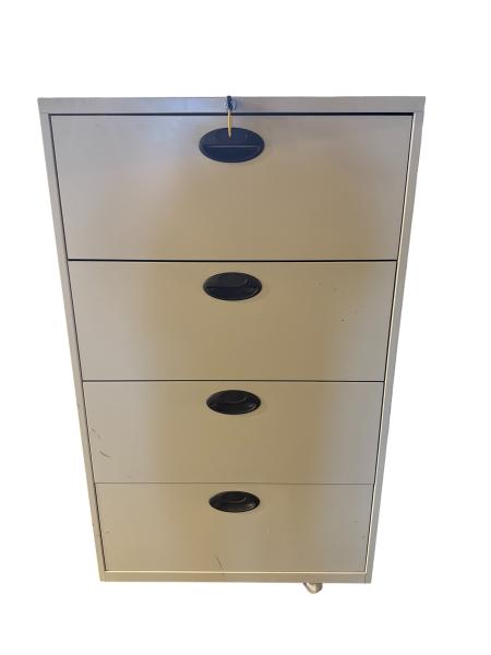 Solid arkivskap i metall med 4 romslige skuffer. Perfekt til kontor, hjemmekontor eller lager. Skapet har lås øverst (nøkkel følger med) og står på hjul, så det er enkelt å flytte ved behov.
