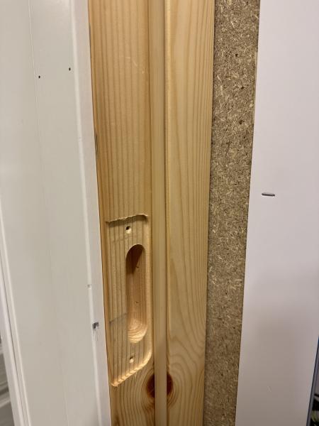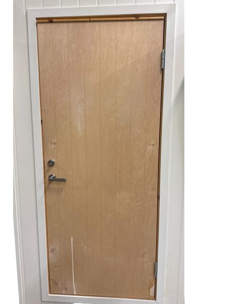 Døren er i god stand, med kun mindre kosmetiske merker nederst som ikke påvirker funksjonen.